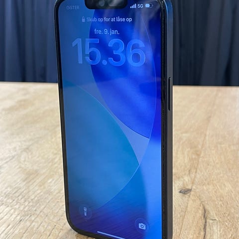 Apple iPhone 13 smartphone med 128 GB lagerplads i farven sort. Telefonen er brugt som arbejdstelefon, og inkluderer original emballage og opladerkabel.