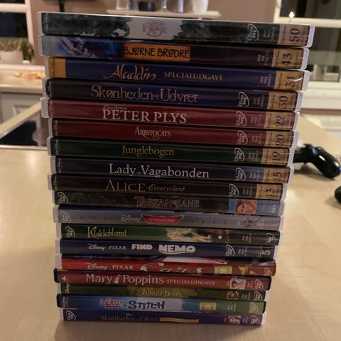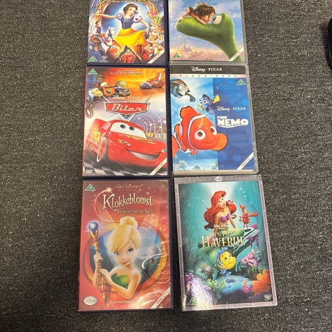 Disney DVD film samling bestående af 9 titler inklusive Find Nemo, De Utrolige, Peter Pan, Tarzan, Mary Poppins, Air Buddies og flere. Filmene er velegnede til børn og familier og indeholder klassiske animations- og spillefilm.
