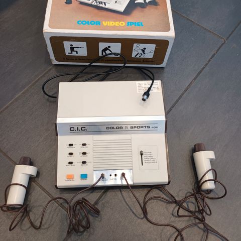 videospilkonsol fra 70’erne, med tilhørende joystick. Gult TV med medfølgende fjernbetjening. Systemet inkluderer kabler til tilslutning og betjening.
