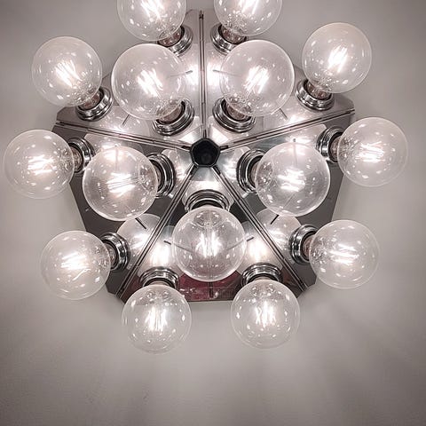 Den smukke Taraxacum 88 loft-/væglampe fra Flos er sammensat af 5 polerede aluminiums trekanter. 15 klare pærer giver et direkte og reflekteret lys. Skab en eksklusiv og hyggelig stemning med denne lampe enten i loftet eller på væggen. Mål: Ø61 x D31 cm Materiale: Aluminium Lyskilde: 15 x LED 3W E27 pærer (inklusiv). Designer: Achille Castiglioni