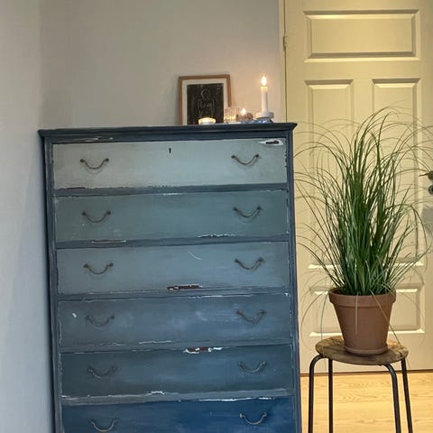Kommoden er nymalet I fin blågrøn farve, og indersiden af skufferne er nymalet hvide. Grebene er nypudsede messinggreb.