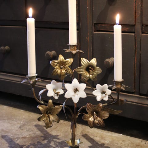 Stor flot fransk kirkelysestage i bronze , dekoreret med bronze liljer og 3 gamle hvide opaline glas liljer ,