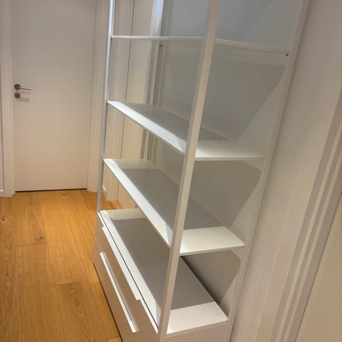 Reolen har 3 hylder, og der medfølger 3 skillerumshylder, som kan sættes lodret, så reolen får 6 rum. Der skal blot fjernes nogle af klistermærkerne.
