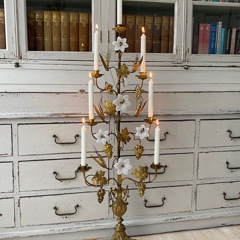 Lysestagen har plads til 3 stearinlys og måler H: 38,5cm. B: 34cm.