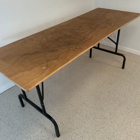 Dette er et klapbord med gråt metalstel og bordplade i lyst trælook. 6 stk. Det ene bord står ikke helt stabilt/vipper.