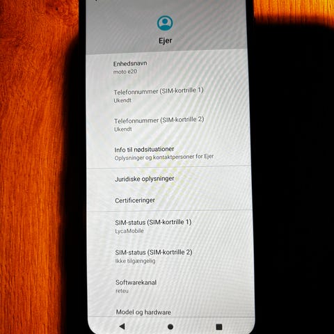 Motorola Moto E20 mobiltelefon med 32 GB hukommelse. Fin stand, få ridser fra brug, men ingen revner eller skader på glas.