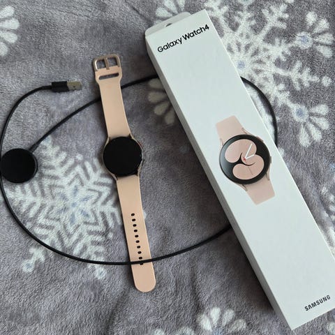 Samsung Galaxy Watch 4 smartwatch i sort farve med rund urskive. Inkluderer ekstra rem og original emballage samt brugervejledninger.