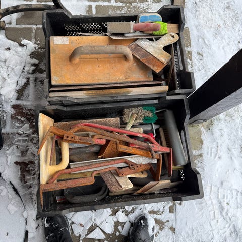 Sælger en kasse med blandet håndværktøj og murerværktøj.