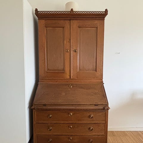 Chatol i massiv eg med 3 store skuffer og skrivebordsplade med hemmligrum og overdel med skabe og skuffer.