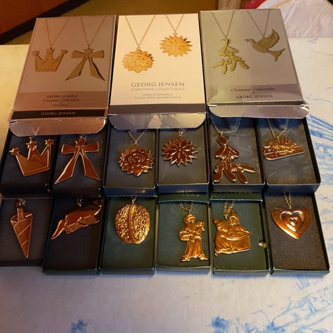 Søger følgende Georg Jensen ornamenter i guld i pæn stand. Der skal medfølge æske.