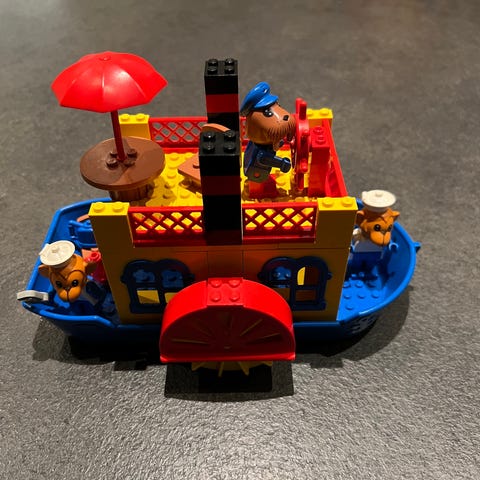 LEGO 3673 Fabuland legetøjsbåd med tilhørende figurer og tilbehør. Sættet indeholder en farverig båd med hjul, to figurer og diverse små dele, herunder en paraply og redskaber. Egnet til leg og samling.