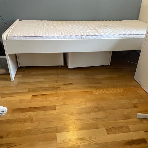 IKEA SLÄKT juniorseng i hvid med indbyggede opbevaringsskuffer under sengen.