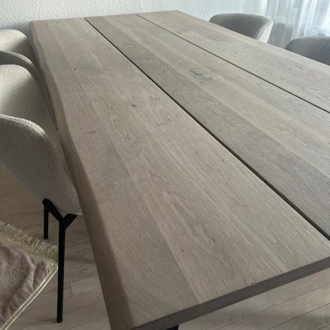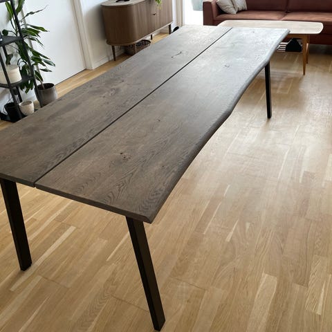 Træet kan fremstå en anelse mørkere på billederne, da bordet er nyligt olieret, og farven derfor er ekstra varm og dyb i udtrykket.