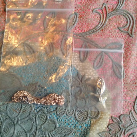 Nyt vedhæng med kæde i sølv , oxideret, stenen kan jeg ikke huske, ligner en krystal,