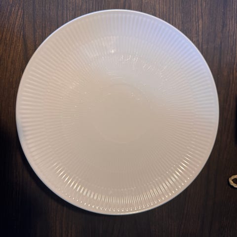 Royal Copenhagen coupe tallerken i hvid porcelæn. Tallerkenen har det karakteristiske riflet mønster langs kanten. Den er 27 cm