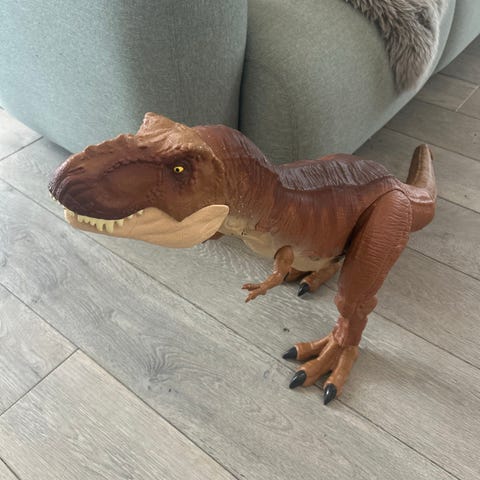 Godt brugt Indominus Rex dinosaur. Lys og lyd fungerer, men den har nogle skader i ansigtets gummi-beklædning - derfor den lave pris. Løs i led, så den har svært ved at stå oprejst. Farven på hovedet er en smule gulnet. Men den er stadig mega sej og et fedt legetøj.