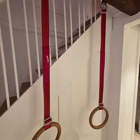 Lækre gym-ringe i træ med Nylon stroppe.