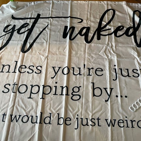 Nyt badeværelse forhæng i vinyl i mørkeblå, grå og hvide farver.
