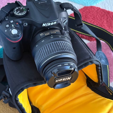 Nikon D5100 DSLR kamera med to objektiver, kamerarem, batterioplader, kamerataske Speedlight.