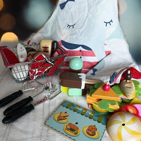 En god blanding af træ-legetøj til legekøkkenet.