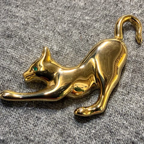Designet er dynamisk og skulpturelt med snoet hale og tydelige detaljer i ben og hoved. Smykket har god tyngde og fremstår solidt, hvilket tydeligt mærkes i hånden. Låsen på bagsiden fungerer perfekt.