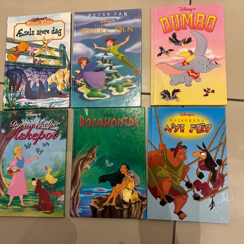 Disney børnebøger med forskellige titler og illustrationer. Bøgerne indeholder kendte figurer som Mickey Mouse, Bambi, Dumbo og Løvernes Konge. Egnet til børn og samlere af Disney-historier.