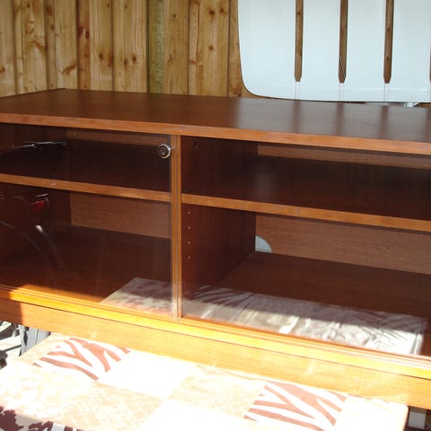 Designet er enkelt, funktionelt og tidløst, inspireret af dansk møbeldesign fra 1960’erne/70’erne. Skydelågerne glider let, glasset er intakt, og møblet fremstår generelt pænt med kun almindelige brugsspor i forhold til alder.