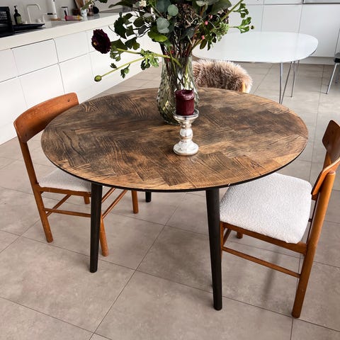 Stilrent og solidt rundt spisebord i hvid/beige. Plads til 4–6 personer. Stabilt, pænt og klar til brug.
