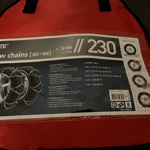 Raze 230 SUV/van kæder til sne til dæk i størrelserne 16" til 19". Sættet inkluderer kæder, der passer til forskellige dækbredder som 215/75-14, 215/80-14, 215/65-15, 225/60-16, 195/80-16, 225/55-17 og 225/40-19. Kæderne leveres i en rød opbevaringspose.