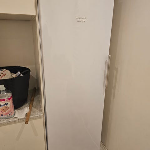 Hoover skabsfryser i hvid farve med flere gennemsigtige skuffer til opbevaring af frostvarer. Fryseren har et enkelt design med et håndtag på døren og et Hoover-logo på fronten.