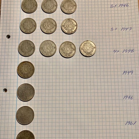3 stk svenske sølv 1 kroner, samlet vägt21 g, årstal, 1948-65 og 1967. Sælges kun samlet. Sender gerne!!!!