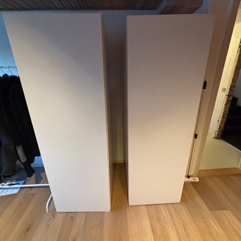 Ikea Platsa med både hylderne og 3 skuffer nederst. Der er 3 flytbare hylder i den øverste del. Der er en knagerække på venstre side, som nemt kan fjernes, hvis du ikke har brug for den.