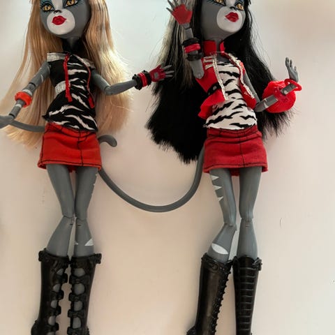 meowlody has slightly worn corners of her mouth. they don't have any accessories just clothes and shoes. their hairstyles aren't factory-made they were done by hand.