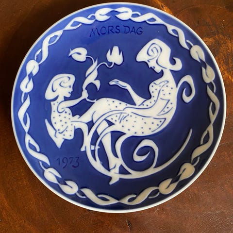 Royal Copenhagen Mor & Barn platte fra 1983, designet af Sven Vestergaard, med et motiv af en kat med killing. Platten er den anden i en serie af seks Mor & Barn platter fra Royal Copenhagen. Motivet er dekoreret under glasuren og omkranset af hvide blomster. Den måler cirka 15,5 cm i diameter. Platterne er sikre at spise af. Meget god stand.