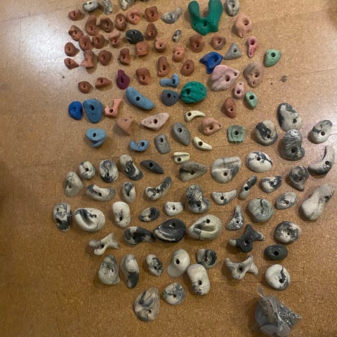 57 professionelle klatregreb i forskellige former og farver sælges. Har kun være brugt indendørs af børn.
