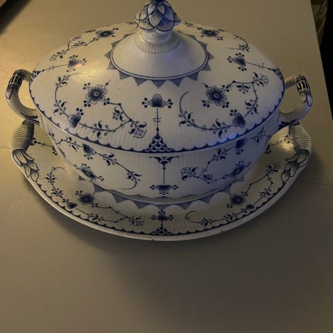 Suppe Terrin i grøn og hvid marmoreret mønster. Årstal ukendt.