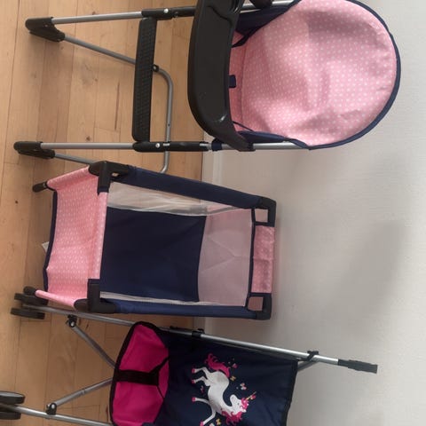 Baby udstyr til dukker. Med badekar med tilbehør, aktivitetstæppe, skråstol og bæresele. Passer til en større dukke som fx. Baby born.