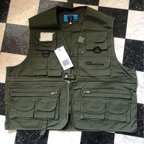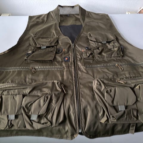 Ron Thompson fiskervest i grøn farve med flere lommer til opbevaring. Vesten har lynlåse og knapper for lukning af lommer og front. Velegnet til fiskeri og udendørs aktiviteter.