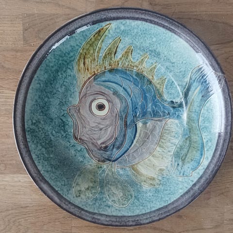 Stort, drejet stentøj. Formodentlig af Leif Max Hansen, som var pottemager i Blovstrød. En del af hans værker er kun signaleret med år og sted, som dette fad.