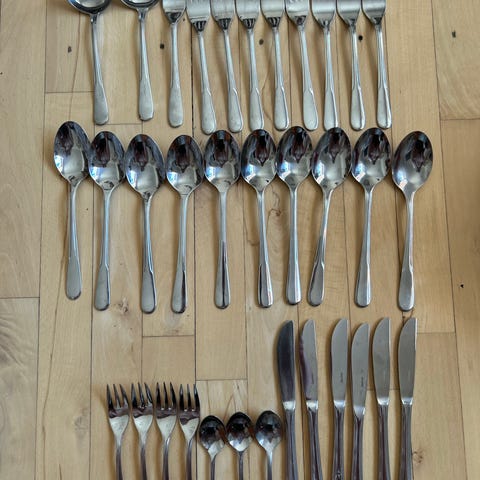 7 gafler, 8 spiseskeer og fem teskeer/ dessertskeer i pæn stand.