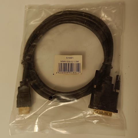 Adapter af typen DVI til HDMI til brug med kompatible enheder. Kabel med DVI-stik i den ene ende og HDMI-stik i den anden.