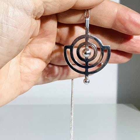 Stort Artig Déco vedhæng i sølv. Vintage 1925-30. Grafiske blade - ranker og sølvperle. Tegnet af Carl Brunsberg Hansen. Virksom i Kbh 1925-39. Smuk stand. Måler 3,5cm x 3cm.
