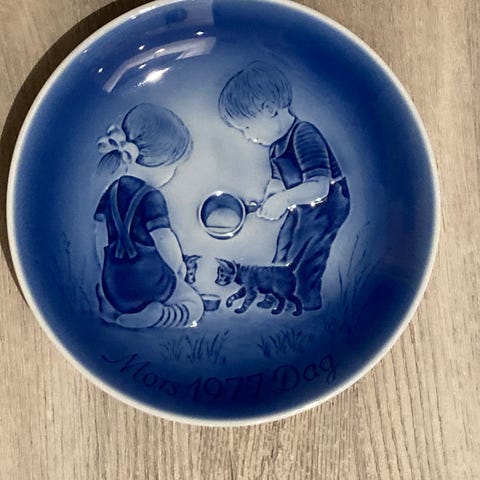 Desiree Mors dags platte fra 1984. Platten er også kendt som Old Copenhagen Blue. Motivet viser en pige, der sidder ved kanten af en sø og ser på en svane. Platten er designet af Mads Stage. Den blev fremstillet af porcelænsfabrikken Désirée Denmark. Teksten på platten er "Mors 1984 Dag. Diameter: 18,7 cm. Meget god stand.