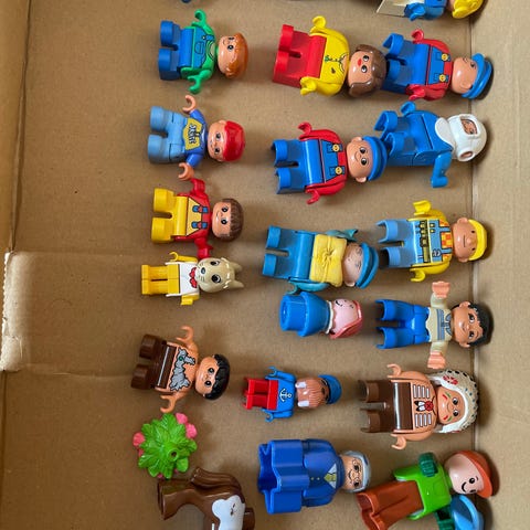 Lille bunke Lego dublo, der er 18 figurer.