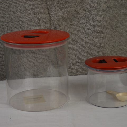 Retro plastbeholdere med røde låg, der kan lukke lufttæt. De er velegnede til opbevaring af fødevarer. Den store beholder er cirka 15 cm høj med en diameter på 15 cm, mens den lille er cirka 9 cm høj med en diameter på 11 cm. Måleske og ekstra låg medfølger.