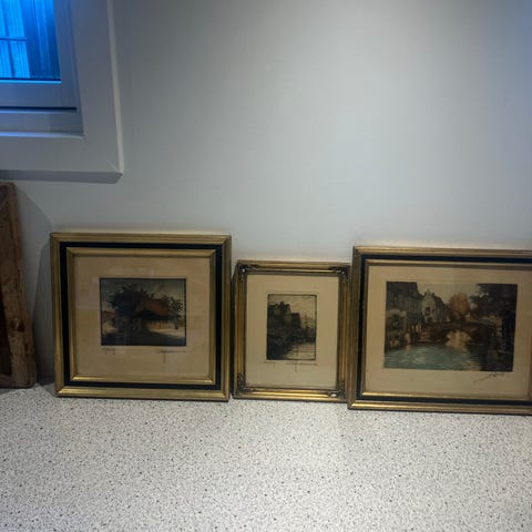 Sæt bestående af 4 malerier med guldrammer. Motiverne inkluderer bybilleder og personer, alle i forskellige farvetoner og stilarter. Rammerne er ens i design og farve, hvilket skaber et samlet udtryk.