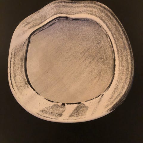 Cirkulært fad dekoreret med sort/hvid askeglasur. Udført hos Kähler Denmark og signeret HAK.