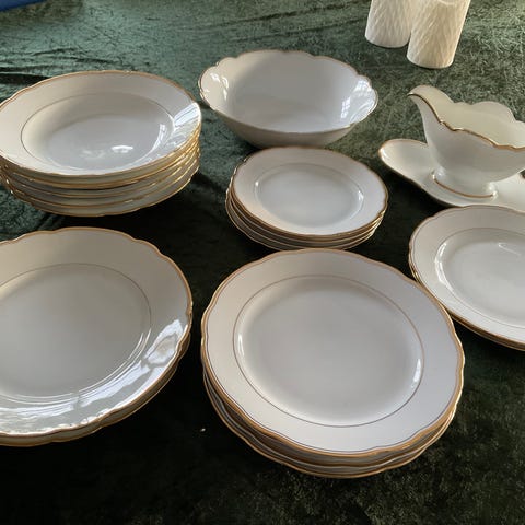 Mere end 40 dele - skåle, tallerkener i forskellige størrelser, kopper og skåle.