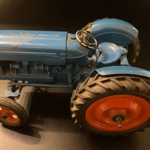 Corgi Toys Ford 5000 Super Major traktor med tallerkenharve. Styretøj, lift, hæve/sænkefunktion på redskabet - alt fungerer. Bonden med kamsketten på sned er på plads bag rattet. Et fint sæt.