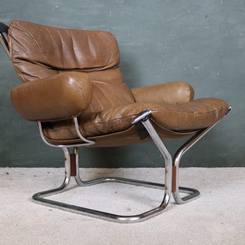 Harald Relling lænestol, i brun/grønlig læder. Har brugspor og patina. Pris 2200 kr pr stk